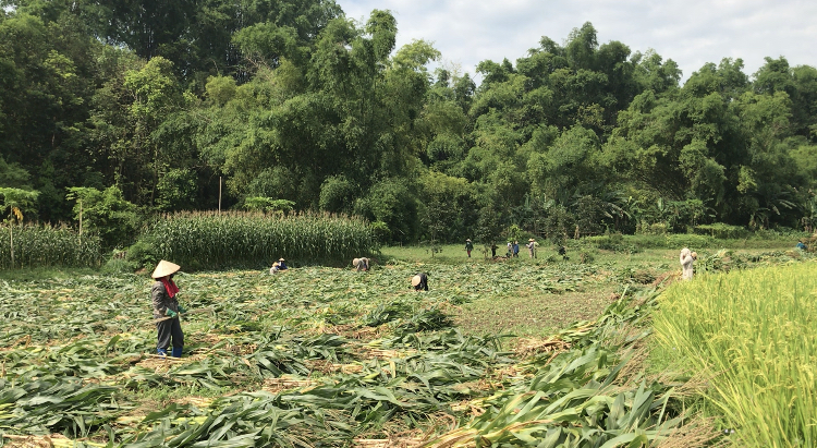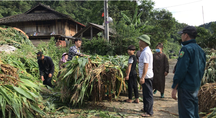 Bà con nông dân thôn Ba Phường, xã Cẩm Giàng, huyện Bạch Thông đổi công thu hoạch ngô sinh khối đợt 1 năm 2021